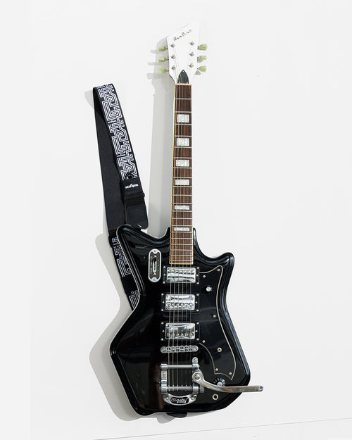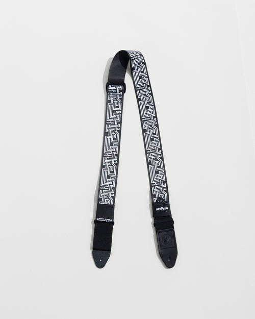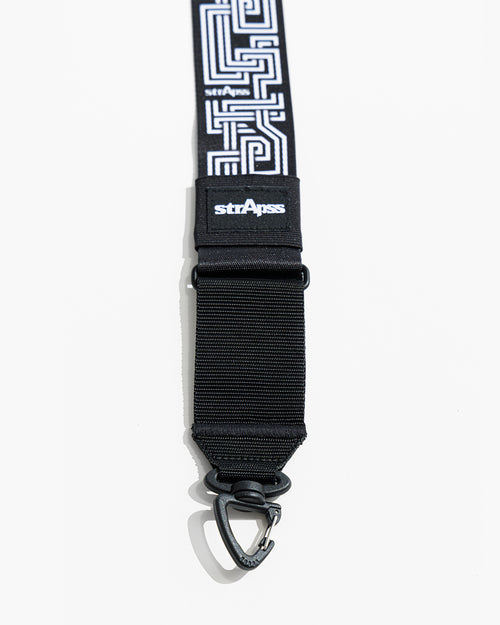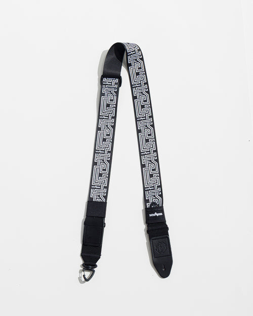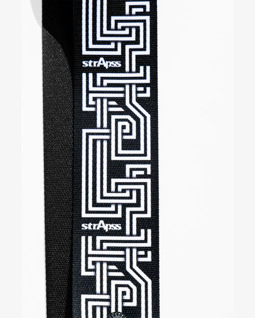 KEIICHI IWATA(7STARS DESIGN)によるアイコニックなデザインが印象的な一本。人と人、音と日常、あらゆるものを隔てなく結びつける「絆」の象徴として、「繋(つなぐ)」をテーマにグラフィックを書き下ろした。モチーフとなったのは、strApssの工場で見た、果てしなく続く長い細幅織物。その光景から着想を得て、strApssの文字をモチーフにした帯状の模様が、途切れることなく続くデザインとして表現。「誰とでも、何とでも、繋がっていける」そんなブランドの想いを、一本の線に託している。糸の選定から厚み・柔らかさの調整まで行い、テープ*1から自社で設計。厚すぎず肩に馴染みやすいフィット感を実現し、長時間の使用でも安定性と快適さを両立。独自のスライド機構*2(実用新案登録申請中)により、ワンアクションでギターストラップからショルダーストラップへ切り替え可能。レザー*3部分は厚み1.9〜2.1mmのスムースな質感で強度と柔軟性のあるスムースレザーを使用。ブランドアイコンにもなっている型押し*4ロゴは、1.5mmの深さで刻印し、革の厚さ・温度・秒数を職人が緻密に調整して仕上げている。